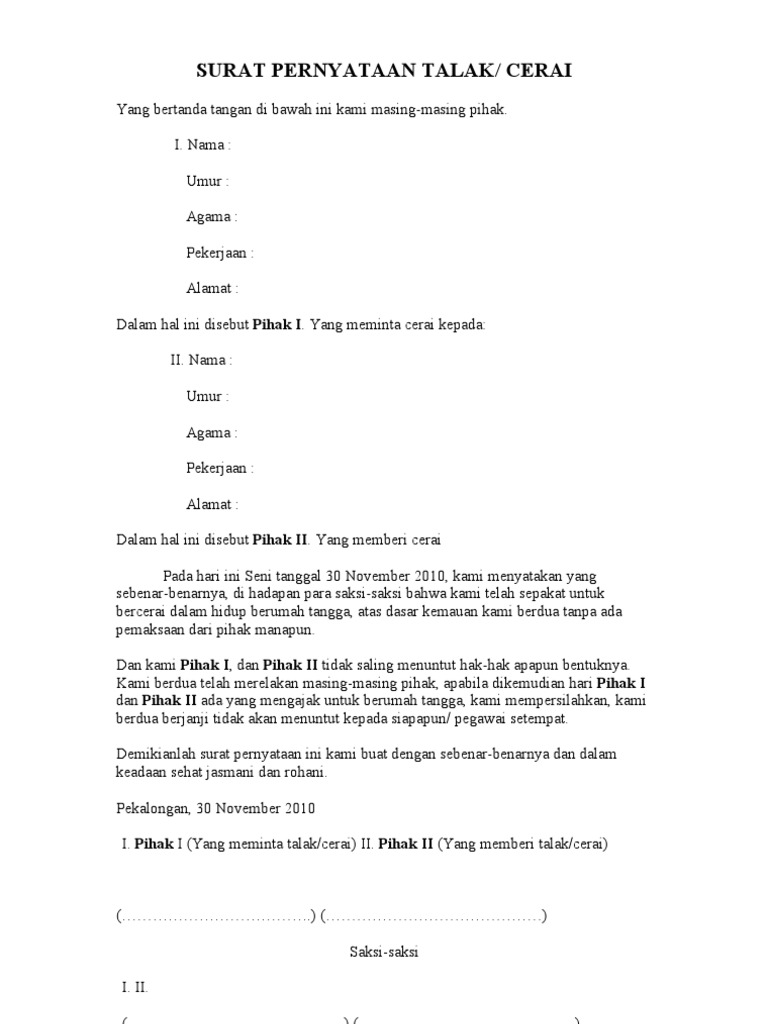 Dan sebagai bentuk proses dari perceraian, maka kita harus membuat surat cerai. Surat perjanjian sering digunakan oleh banyak pihak, baik perorangan maupun perwakilan kelompok tertentu.berikut 4 contoh surat perjanjian yang bisa anda. Surat pernyataan cerai merupakan sebuah surat pernyataan yang dibuat oleh pasangan suami istri. Isinya berupa pernyataan bahwa kedua belah pihak yang telah sepakat untuk memutuskan berpisah atau. Di dalam surat kesepakatan itu, nantinya akan tertera berbagai poin perjanjian yang telah disetujui bersama.
